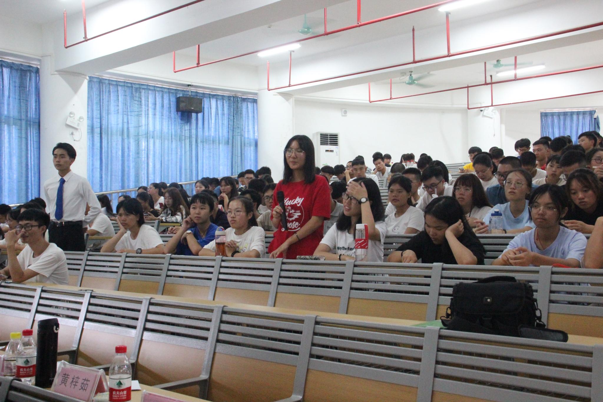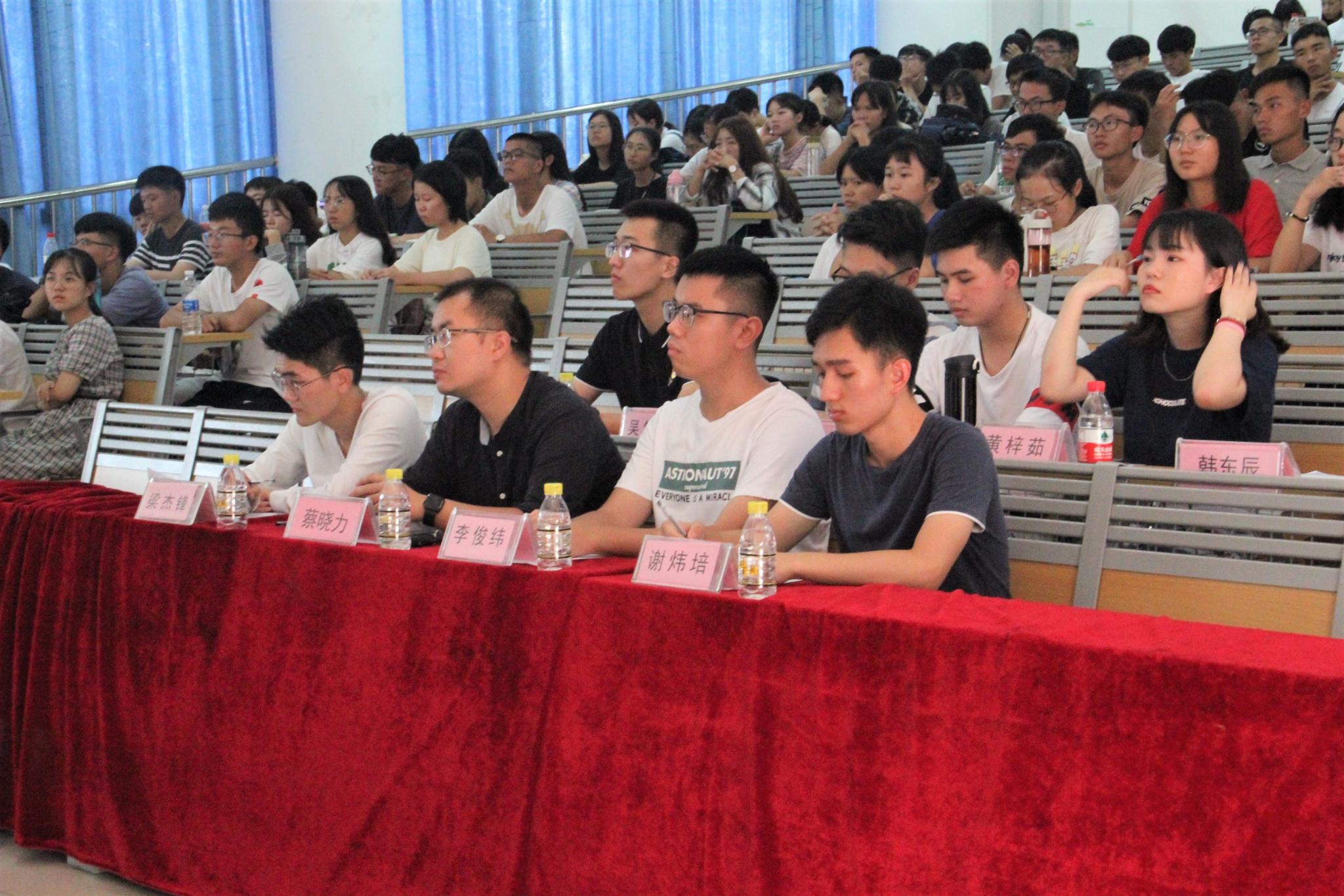 韩东辰、黄梓茹、温雨航、吴锦豪和黄培煌等五位优秀老生代表,把自己在大学的生活、学习、社会工作等方面的经验分享给新生。韩东辰同学着重强调了学生干部的原则,学生在前,干部在后。时刻要以学习有保障的情况下,开展自己的部门工作。并分享了他的社会工作经历,希望新生要合理安排自己的作息时间,过好大学四年的生活。