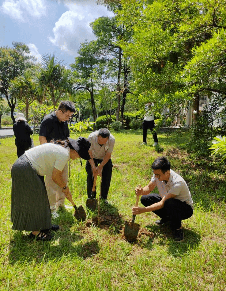 黄书记代表学院向校友们介绍了近年来学院在教学、科研、社会服务等方面取得的成就。谢勇老师对同学们在校时的学业、生活和文体表现等记忆犹新,对各位校友的在校事迹如数家珍。为表达对母校的培育之恩,环科111班校友自发组织捐赠了四株黄花风铃木。校友们与黄书记、谢勇老师在学院楼前携手完成挖坑、培土、浇水植树活动。黄花风铃木花期长、适应性强,象征校友与母校之间深厚持久的情谊。下午,校友们驱车到达海珠校区进行座谈和茶叙。