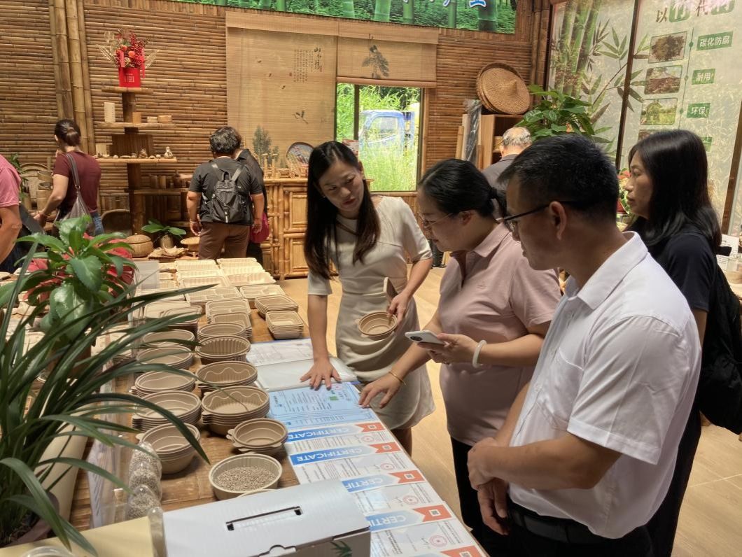 最后,交流团队走进广东竹笙笙科技有限公司,该公司是西牛镇麻竹笋产业转型升级的代表性企业,其研发的可降解“竹纤维基材料”制成系列产品—— 竹笋纤维餐具、竹笋纤维包装材料和农膜等,凭借环保、可降解、综合成本低等优势,已成功进入餐饮、电商包装及农业生产等领域。