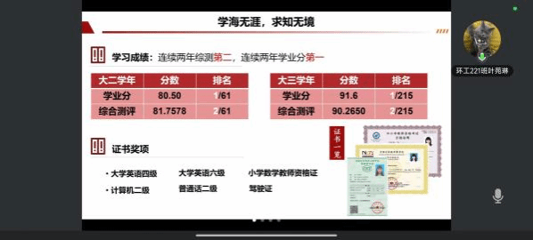 会上,参加答辩的5名同学根据自己在校期间的思政表现、学业成绩、创新竞赛、社会实践、志愿服务和文体表现等方面进行了PPT汇报。评委们针对每位选手的陈述表现进行提问,候选人的沉着应答展现了超强的综合能力。