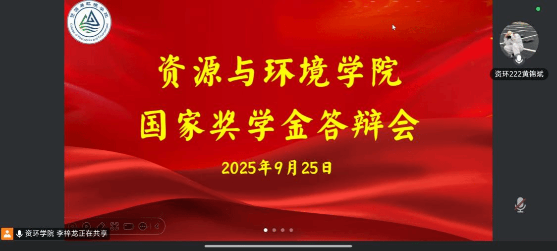 为充分发挥国家奖学金的引领作用,激励同学们努力进取。9月25日,资源与环境学院以线上会议的形式举行2025年国家奖学金评选答辩,学院党委书记黄礼彬、副书记邓艳桃,辅导员、班主任及学生代表们担任本次答辩会评委。