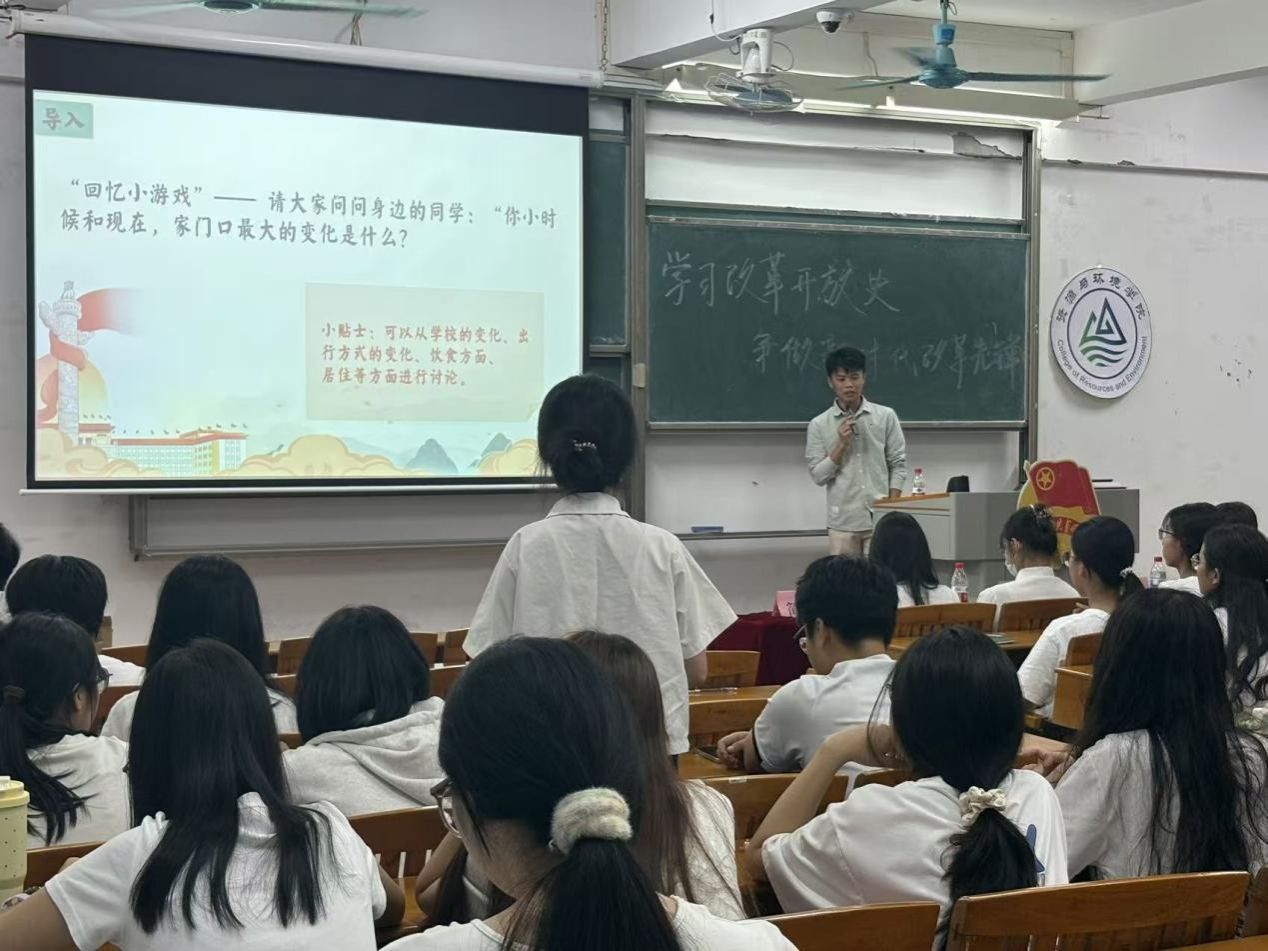 团课以“从‘家门口的变化’解码改革开放的温度与力量”为核心,以同学们身边的生活变迁(如出行方式从自行车到高铁、饮食从“吃饱”到“吃好”、居住从平房到楼房)和改革开放关键历史节点(如党的十一届三中全会召开、经济特区设立、加入世界贸易组织、自贸试验区建设)的影像资料、对比图片作为切入点,深入挖掘每一处“家门口变化”背后关联的改革决策与时代背景。一幅幅新旧对比图、一段段生活场景影像,清晰展现了改革开放从起步探索到全面深化的历程,以及从经济领域到民生领域的全方位成就,让同学们直观感受到改革与自身生活的紧密联系,深刻体会到改革开放带来的“温度”与发展“力量”。
