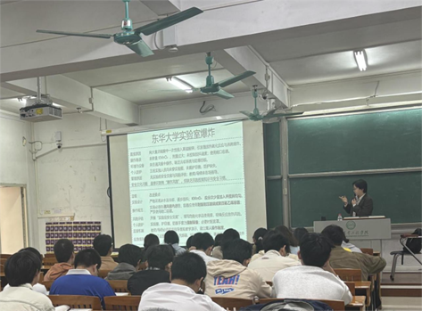 欧阳葳葳老师以“化学实验室安全概论”为题,通过案例分析梳理课程框架,聚焦安全意识、风险识别与应急处置等要点展开教学。课堂条理清晰、氛围严谨而不失活跃,有效提升了学生科研安全素养。