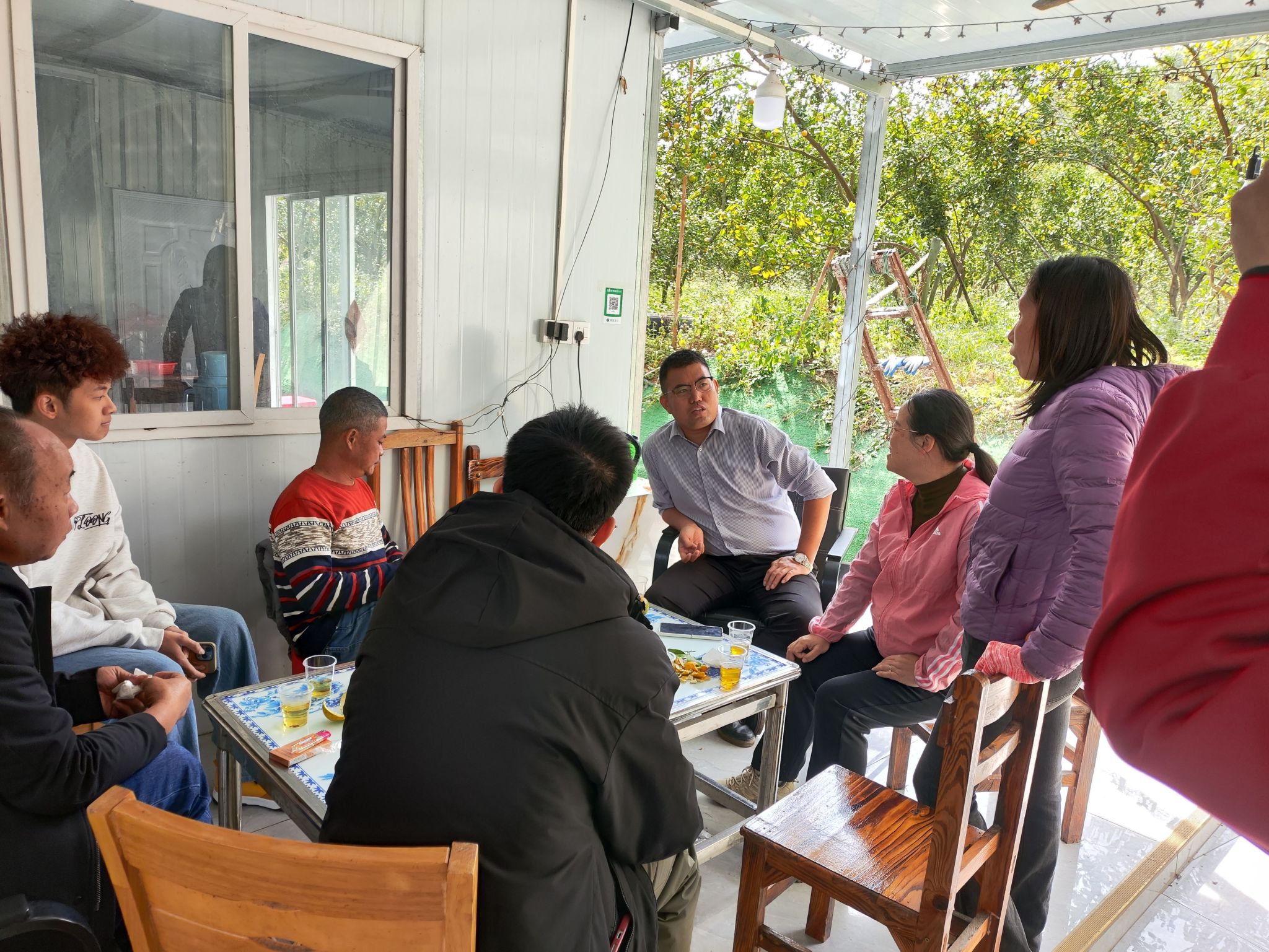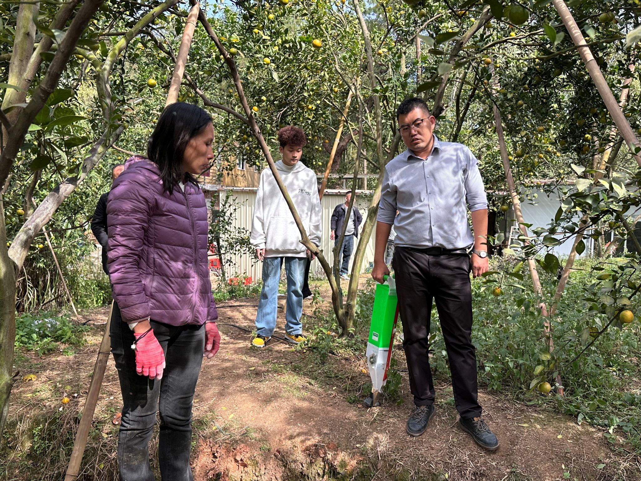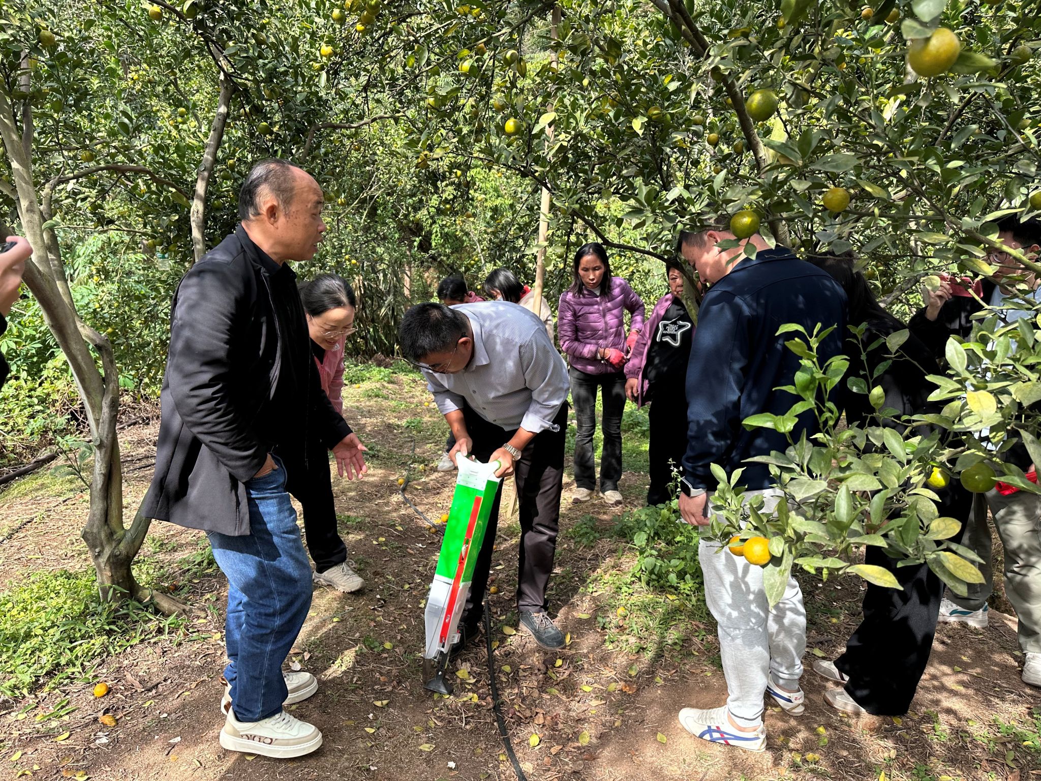 理论学习结束后,特派员团队带领参训人员前往云浮市云城区思劳镇城村贡柑种植示范基地开展现场实操教学。在贡柑种植基地,陈海斌老师现场演示了优质绿肥品种——光叶苕子的种植方法,详细讲解了播种密度、后期水肥管理等关键实操要点。直观的示范操作让抽象的技术知识具象化。操作方便的播种工具让大家耳目一新,意识到绿肥种植并不会增加过多“农活”,参训人员热情高涨,纷纷动手实践,主动向专家请教种植疑问,现场交流氛围浓厚,原本半信半疑的种植户逐渐转变为跃跃欲试的实践者。此外,特派员团队还现场采集了土壤样品,特派员专家也针对种植户提出的贡柑病虫害防治、修枝整形、流胶病防治、树皮青苔清除等种植难题,进行了一对一答疑指导,提供可行的解决方案。