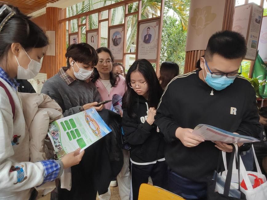 在摆摊现场,队员们向学弟学妹介绍我校概况与校园环境等。互动答疑环节气氛热烈,学弟学妹们围绕“物理类/历史类录取分数线大概多少?”、“校园社团活动丰富吗?”、“仲恺地理位置优势是什么”、“食堂怎么样?好不好吃?”、“我选的物地生可以考虑仲恺吗?”等问题进行提问。团队成员结合2025年招生数据与自身求学体验,逐一细致解答。