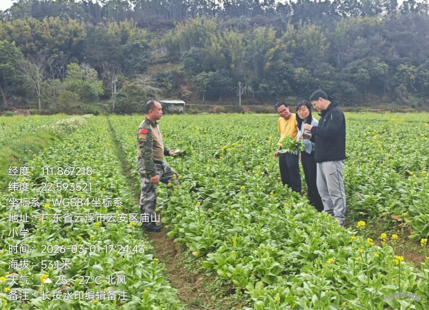 在庙山村谷缘公司种植基地,连片的菜心正值收割,一车车鲜蔬正源源不断地运往云浮与广州。团队与种植大户正一边察看“花生-水稻-蔬菜”轮作模式的蔬菜收获期景象,一边总结去年科技赋能生态大米在珠三角销售的得失。基于这一高效轮作模式带来的实际效益,双方现场达成两项深度合作共识:一是品种升级,示范推广花生新品种,进一步提升品质与效益;二是智力下沉,探索共建“科技小院”,将高校人才与技术直接引入田间,以科技力量解决生产难题,通过科学轮作实现“一田多收”,助推产业全面升级。